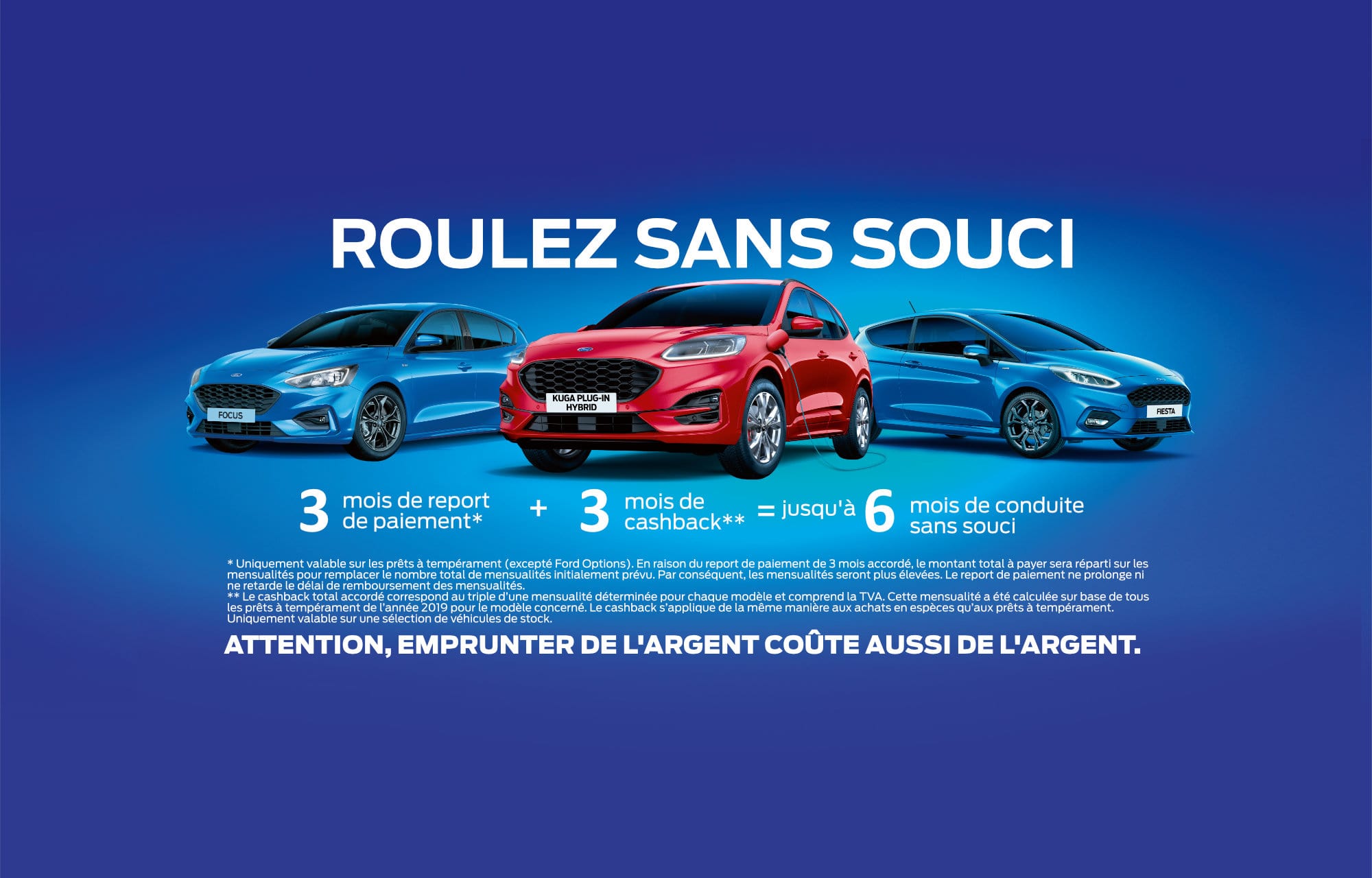 Le cashback total accordé représente un montant fixe qui dépend du modèle choisi. Ce montant correspond au triple de la mensualité moyenne du modèle concerné, sur base de tous les prêts à tempérament de l’année 2019 pour ce modèle. Le cashback s’applique de la même manière aux achats en espèces qu’aux prêts à tempérament. Le cashback est uniquement valable sur une sélection de véhicules de stock. Le cashback est de 975 € pour Fiesta, EcoSport et Puma et 1.350 € pour Focus et Kuga (TVA comprise). Ces montants ont été déterminés comme suit :1 mensualité moyenne prêt à tempérament 2019 3 mensualités moyennes Prime cashback